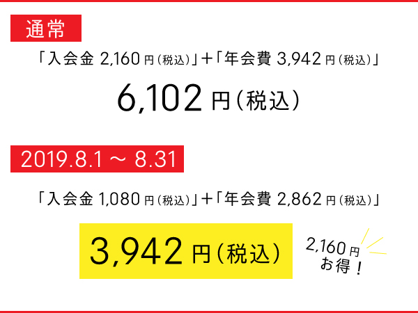 それが今月8月1日から31日までの1か月のあいだに入会及びご登録いただきますと「入会金が1,080円(税込)」で、さらに「年会費が2,862円(税込)」と1,080円(税込)の値引きとなります。
