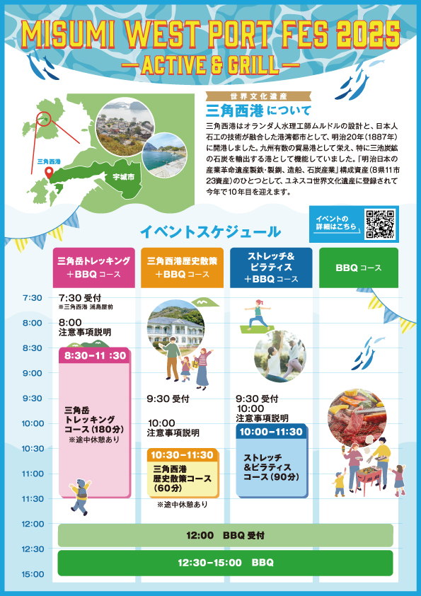 アクティビティは「三角岳トレッキング」「三角西港歴史散策」「ピラティス&ストレッチ」の3コース。