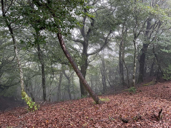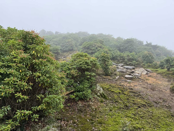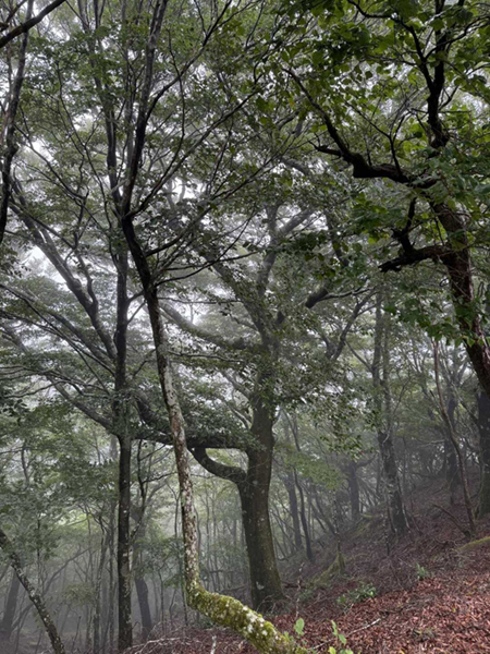 そこからは多少のアップダウンを繰り返して山頂に到着となりました。あいにく、山頂はガスとなっていて脊梁山脈の展望はかないませんでした。