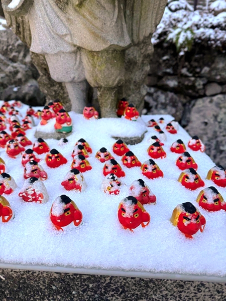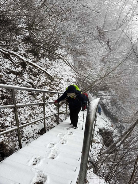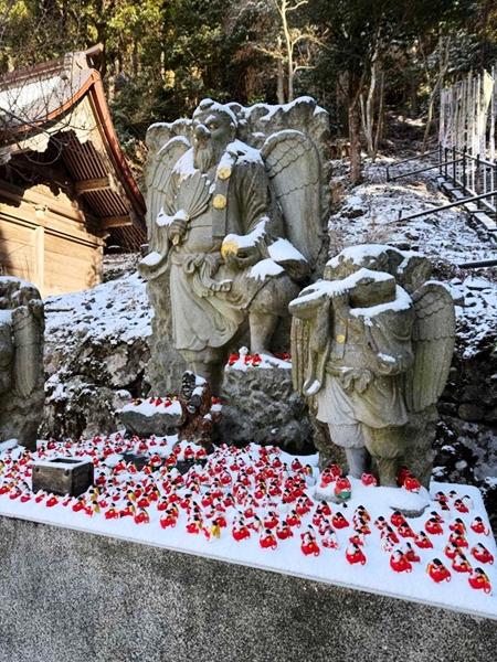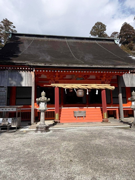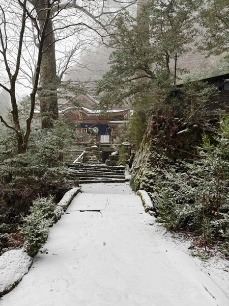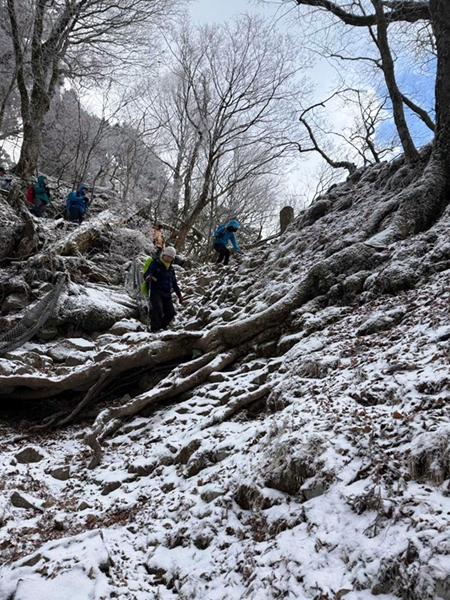 中岳への縦走路は風もなく、雪遊びをしながら中岳へと到着。東屋にて昼食をとり、新しくなった上宮に参拝して下山となりました。雲も取れて青空となり、温かな雰囲気の中、奉幣殿へと下山しました。 奉幣殿と途中の茶屋「はなやま」にも立ち寄って帰路につきました。
