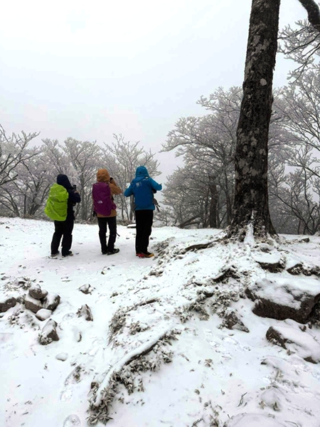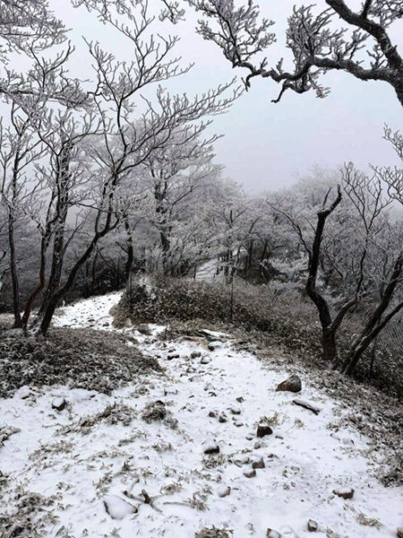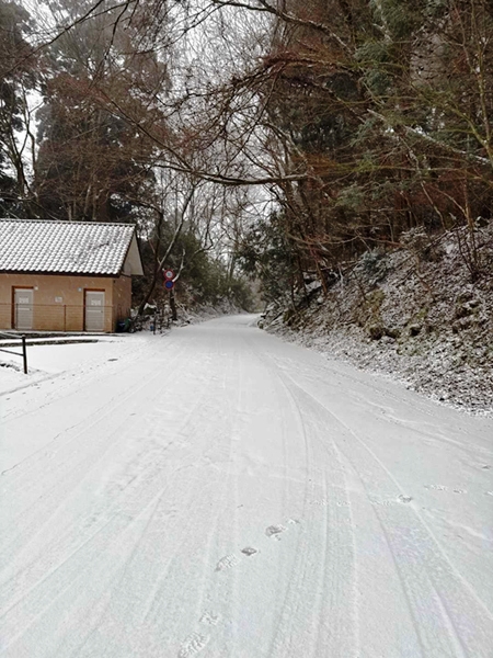 登山口までの道中は小雨でしたが、道の駅小石原あたりから雪となり、登山口の豊前坊では雪景色となりました。