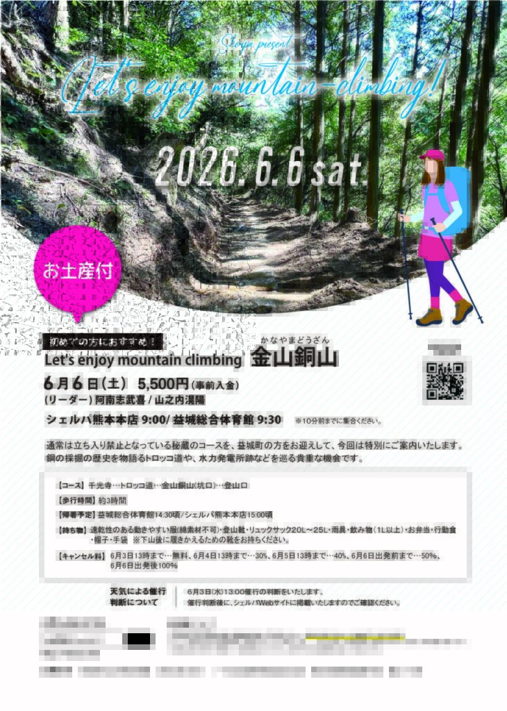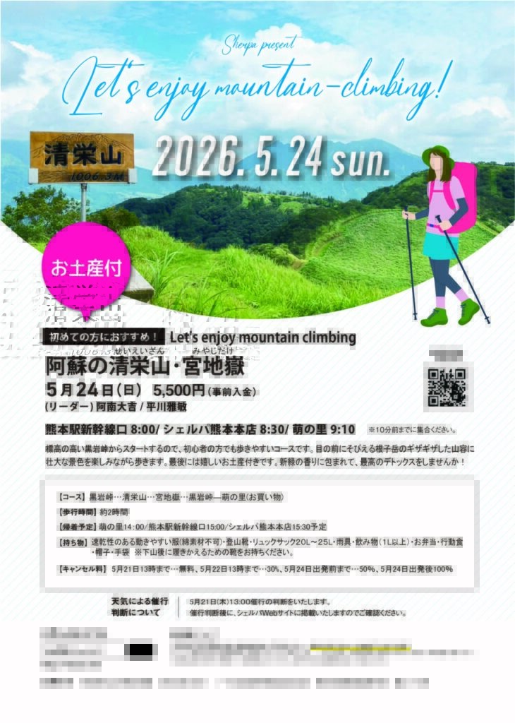 ※山行きプログラムにご参加の方はシェルパ熊本店の電車通り側駐車場をご利用ください。シェルパ熊本店の正面駐車場には駐車しないようお願いいたします。