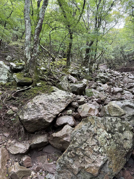 今回は鶴見岳西登山口の猪の瀬戸から登り、南平台(1216m)を経由して登ります。取り付きは林道から始まり、沢の入り口からが本格的な登山となりましたが以前よりも沢が土石流で荒れてて登るのに時間がかかりました。